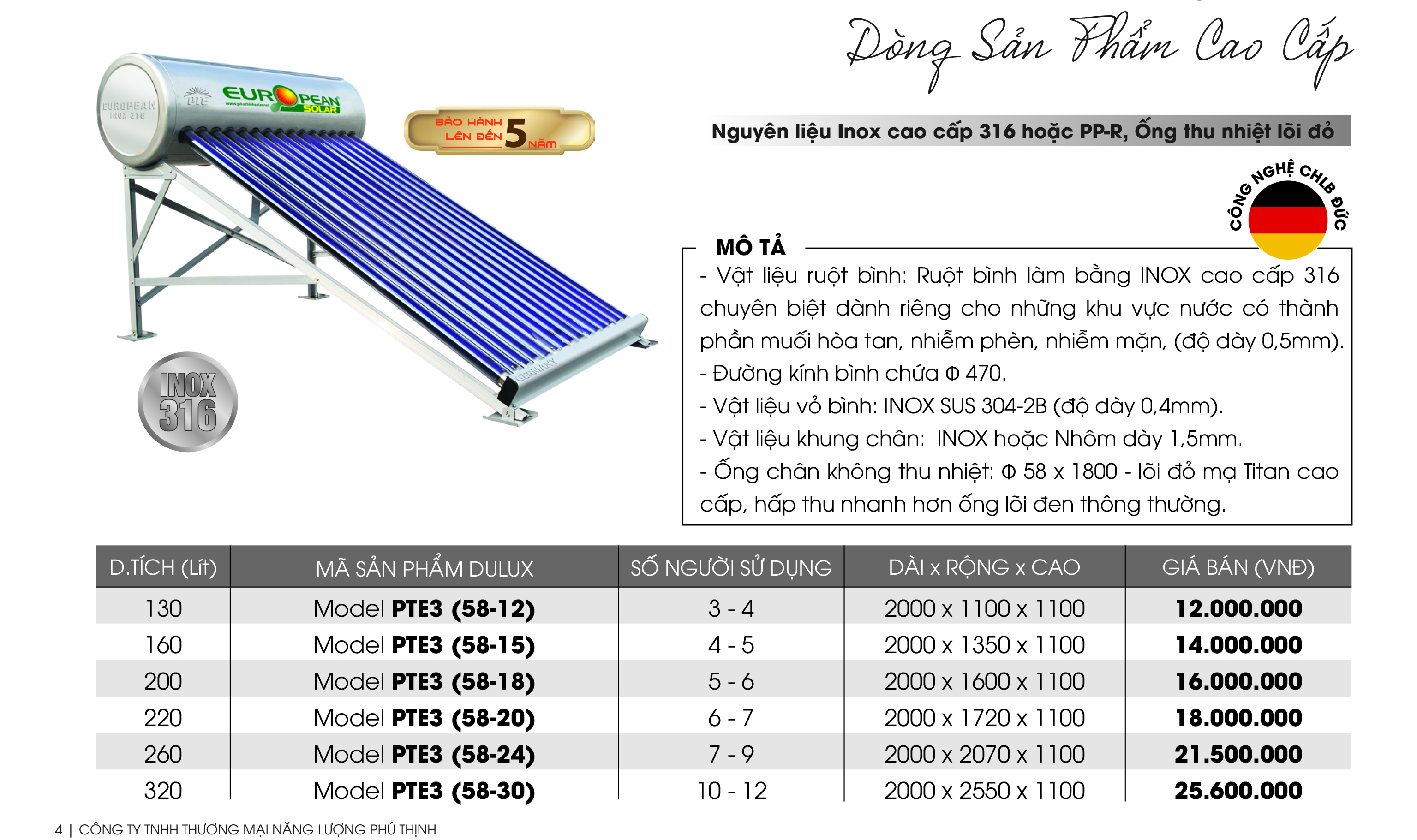 - Vật liệu ruột bình Solar European: Inox 304 dày 1.5mm